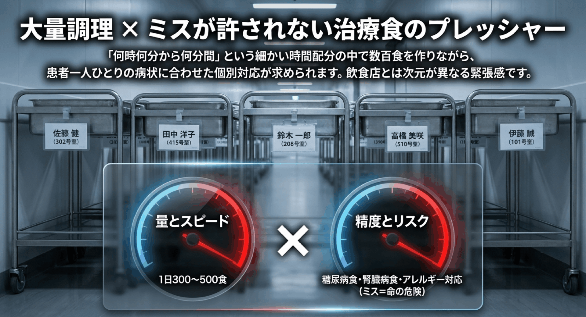 病院調理師がきつい理由は、早朝三食対応による生活リズムの乱れ・分単位のタイムプレッシャー・治療食対応のミスが許されない緊張感・複雑な指示系統・やりがいの見えにくさという5つの構造的な問題に集約されます。